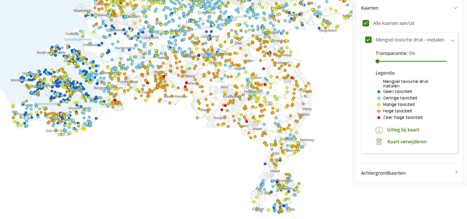 Op de Atlas Natuurlijk Kapitaal geven zes kaarten een beeld van die toxische druk. De kaart Mengsel toxische druk – alle gemeten stoffen geeft een beeld van het effect dat alle aangetroffen stoffen samen in interactie met elkaar hebben op het leven in en rond en het water.